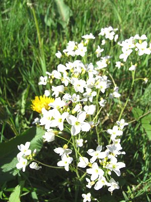 | Familie: Kreuzblütengewächse (Brassicaceae) Volksnamen: Bettsoicher, Harnsamen Griesblümel Beschreibung: Wiesenschaumkraut wird etwa 15 bis 40 cm hoch. Es hat einen runden, hohlen Stängel und ist mehrjährig. Die Blätter des Wiesenschaumkrauts sind unpaarig gefiedert. Die Grundblätter wachsen in einer auffälligen Rosette, die manchmal dicht an den Boden gedrückt ist und oft überwintert. Sonstiges: Wiesenschaumkraut ist essbar, doch wird es kaum noch als Salat gegessen wie früher. Für den hübschen Aurorafalter ist das Wiesenschaumkraut dagegen die einzige Nahrungspflanze. |